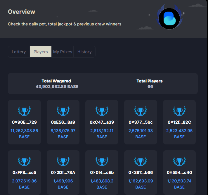 On the My Prizes tab users can check their Daily Pot wins, Jackpot wins, Daily Pot gains (in USD), Jackpot gains (in USD) and how much BASE have you wagered.